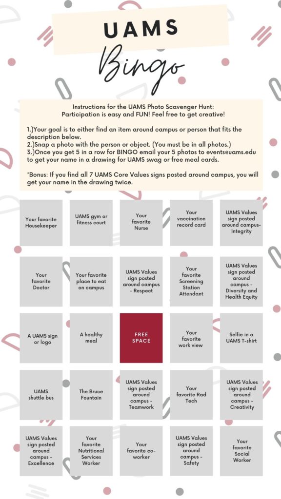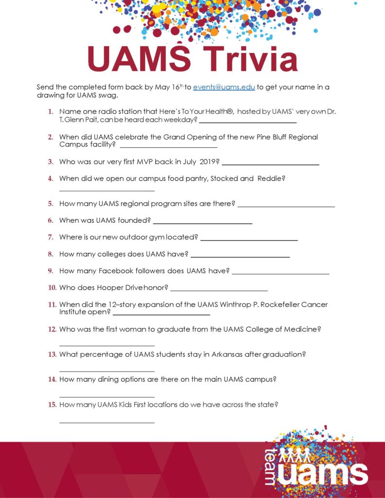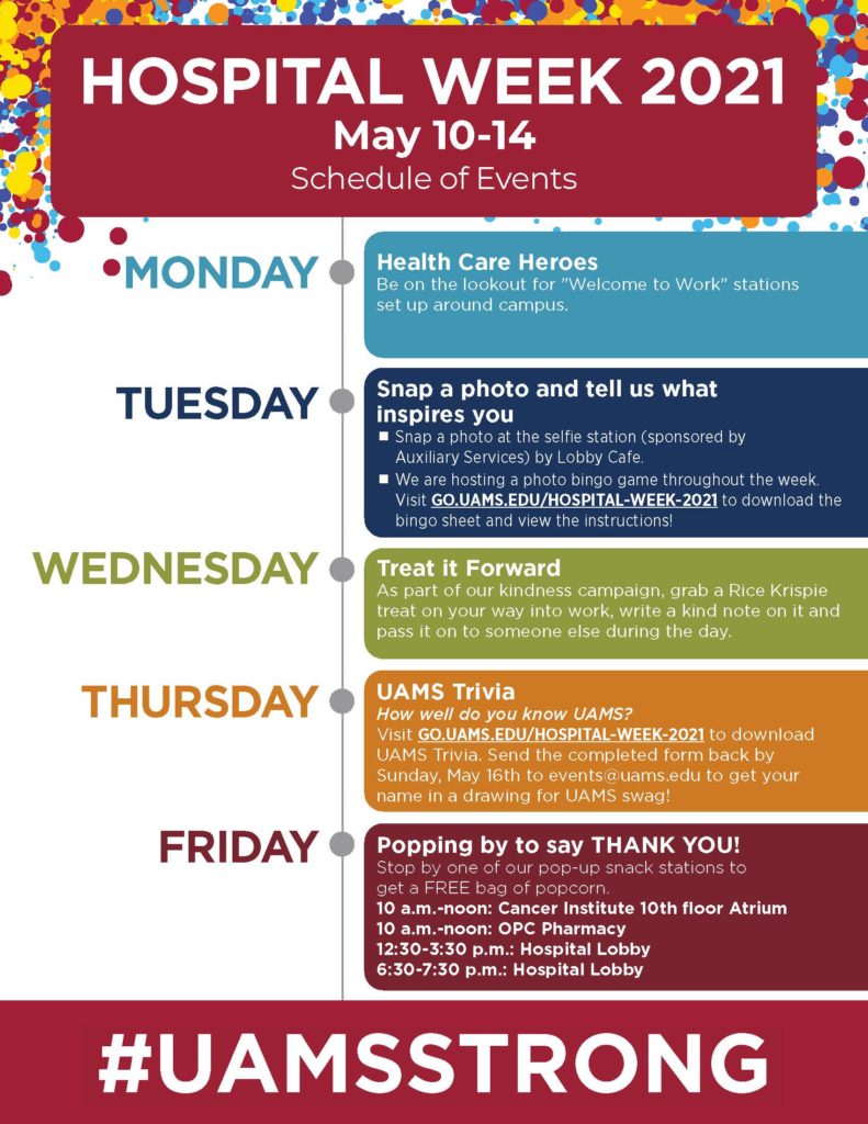 Hospital Week 2021 Download our Hospital Week activities below. Instructions are on each. Make sure to email your finished activities to events@uams.edu to be entered into drawings! Hospital Week 2021 Photo Scavenger HuntDownload UAMS Hospital Week Trivia 2021Download